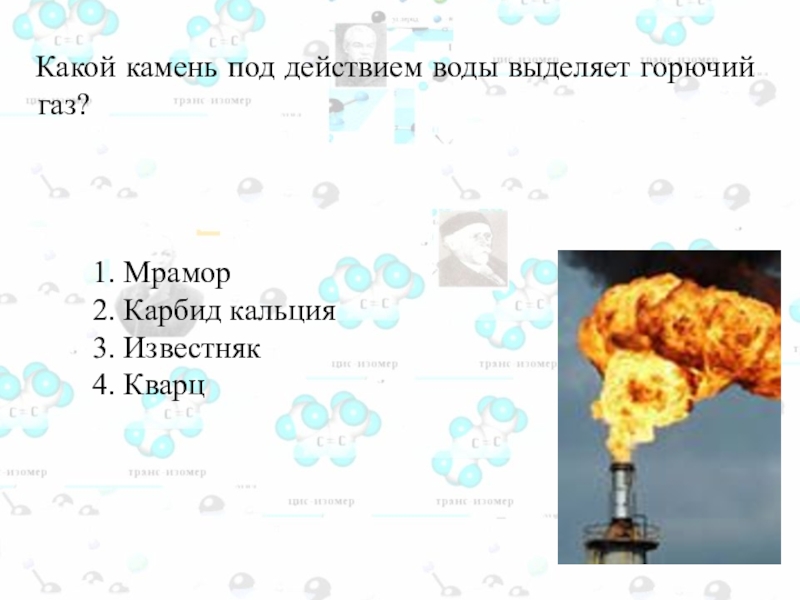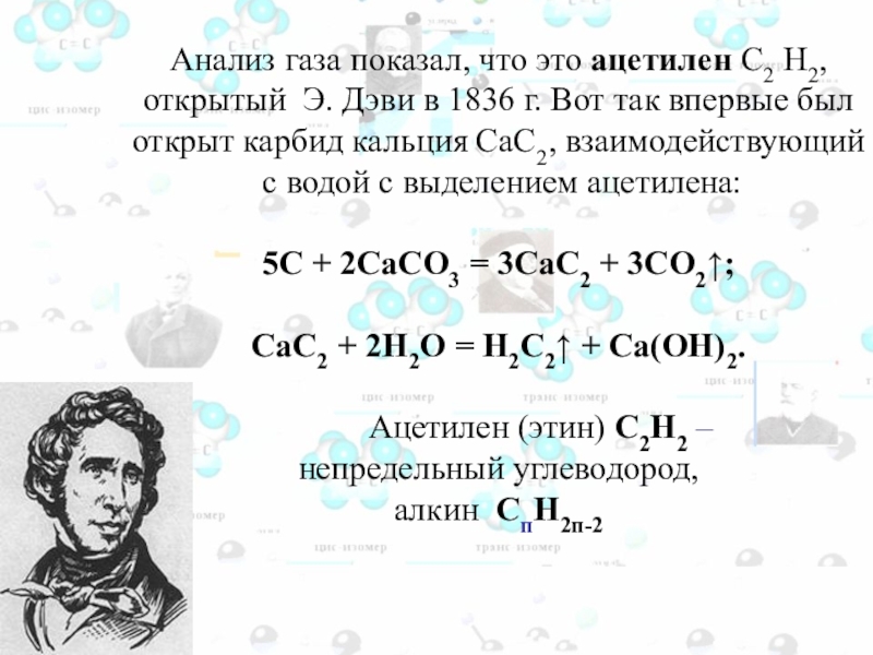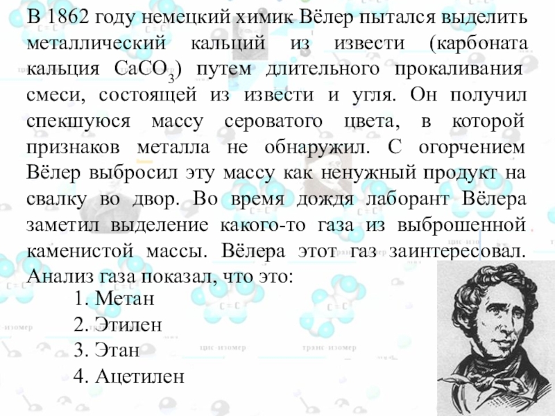 кальций из извести (карбоната кальция CaСО3) путем длительного прокаливания смеси, состоящей из извести и угля. Он получил спекшуюся массу сероватого цвета, в которой признаков металла не обнаружил. С огорчением Вёлер выбросил эту массу как ненужный продукт на свалку во двор. Во время дождя лаборант Вёлера заметил выделение какого-то газа из выброшенной каменистой массы. Вёлера этот газ заинтересовал. Анализ газа показал, что это: