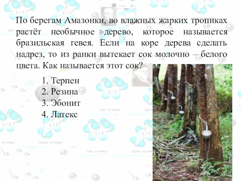 растёт необычное дерево, которое называется бразильская гевея. Если на коре дерева сделать надрез, то из ранки вытекает сок молочно – белого цвета. Как называется этот сок?