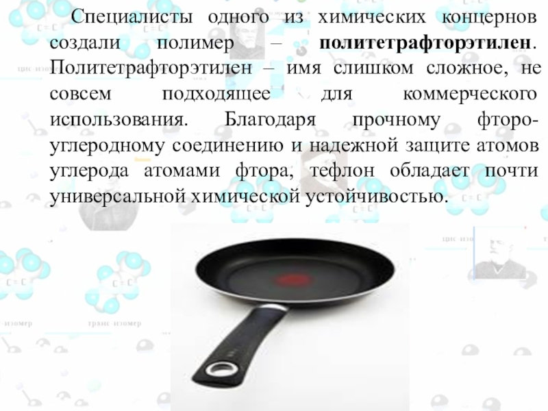 Слайд 10 Специалисты одного из химических концернов создали полимер – политетрафторэтилен.