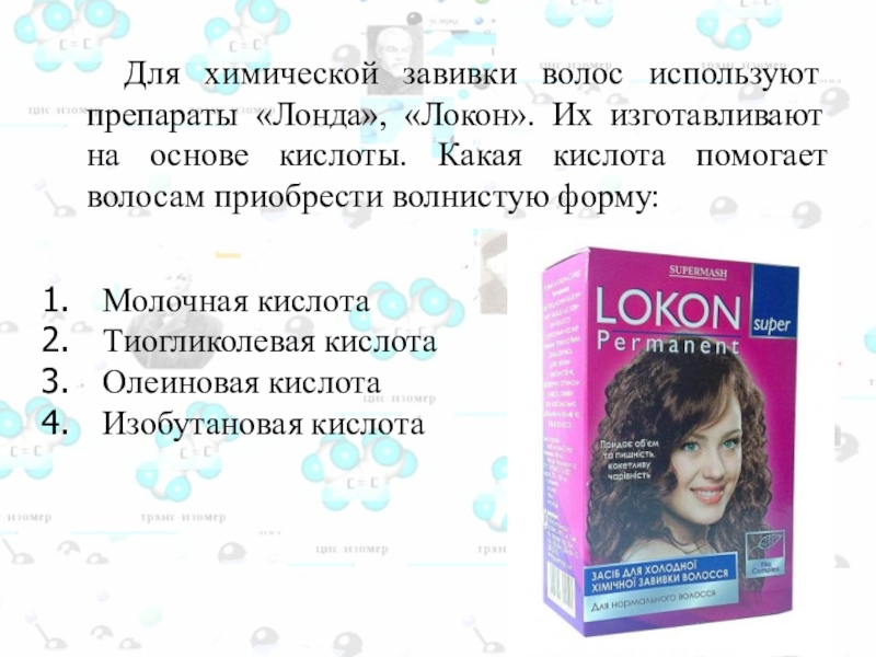 «Локон». Их изготавливают на основе кислоты. Какая кислота помогает волосам приобрести волнистую форму:
