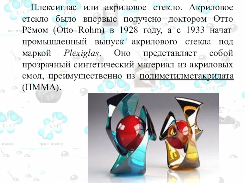 Слайд 115 Плексиглас или акриловое стекло. Акриловое стекло было впервые получено