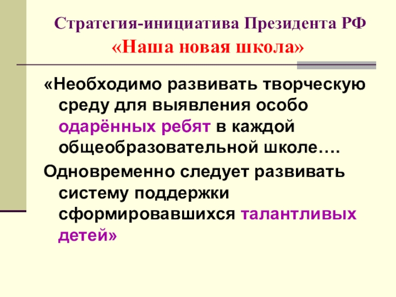 Стратегия-инициатива Президента РФ «Наша новая школа» «Необходимо развивать творческую среду для выявления особо одарённых ребят