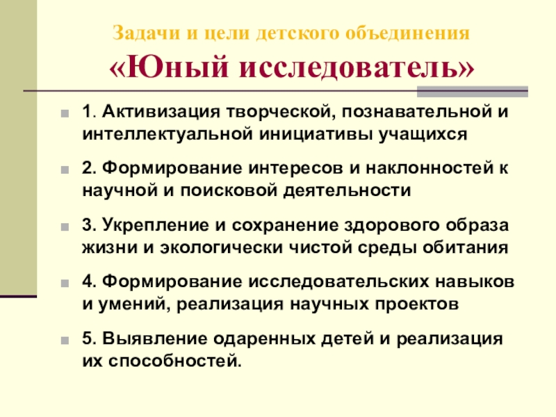 Слайд 11Задачи и цели детского объединения «Юный исследователь»