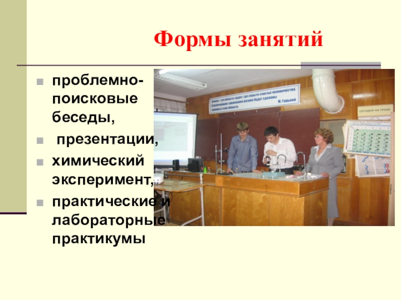 Формы занятийпроблемно-поисковые беседы, презентации, химический эксперимент, практические и лабораторные практикумы