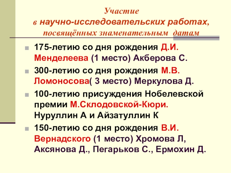 Участие  в научно-исследовательских работах,  посвящённых знаменательным датам175-летию со дня рождения Д.И.Менделеева (1 место) Акберова С.300-летию