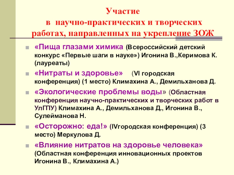 «Нитраты и здоровье» (VI городская конференция) (1 место) Климахина А., Демильханова Д.