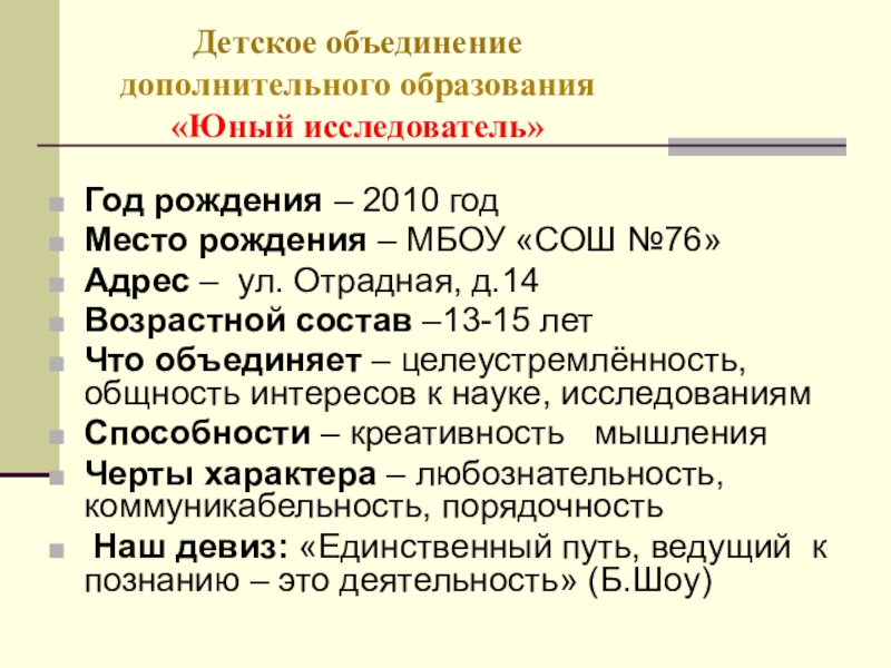 Детское объединение  дополнительного образования «Юный исследователь»Год рождения – 2010 годМесто рождения – МБОУ «СОШ №76»Адрес –