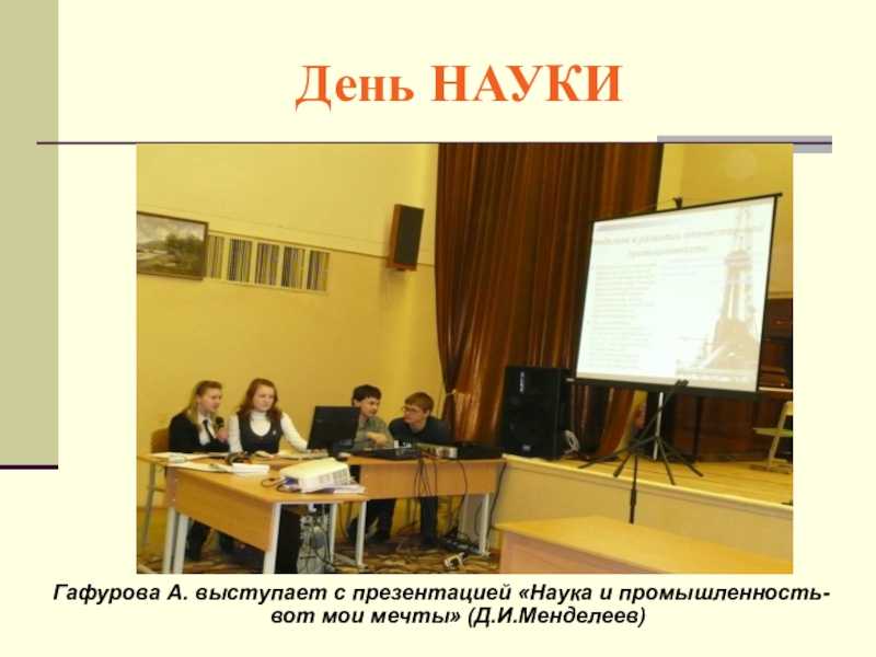 День НАУКИГафурова А. выступает с презентацией «Наука и промышленность-вот мои мечты» (Д.И.Менделеев)