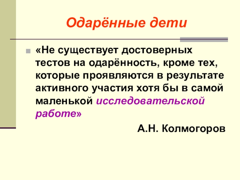 Одарённые дети«Не существует достоверных тестов на одарённость, кроме тех, которые проявляются в результате активного участия хотя бы в самой маленькой исследовательской работе» А.Н. Колмогоров