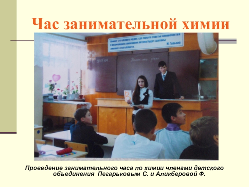 Час занимательной химииПроведение занимательного часа по химии членами детского объединения Пегарьковым С. и Аликберовой Ф.