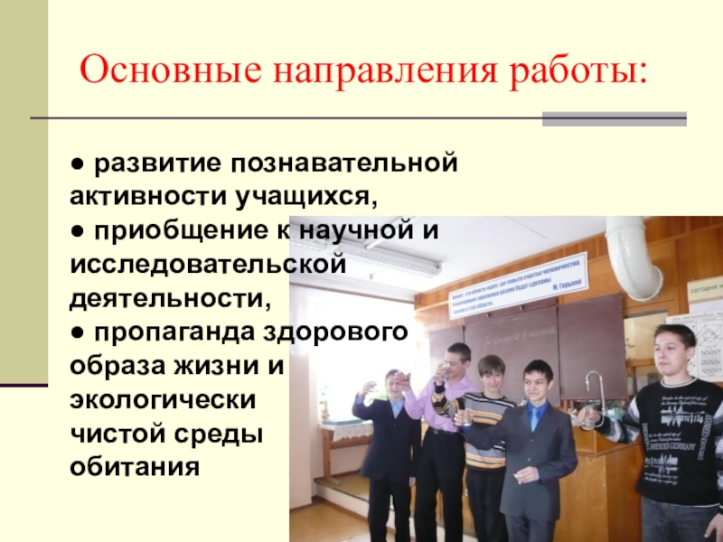Основные направления работы:● развитие познавательной активности учащихся, ● приобщение к научной и исследовательской деятельности,● пропаганда здорового образа