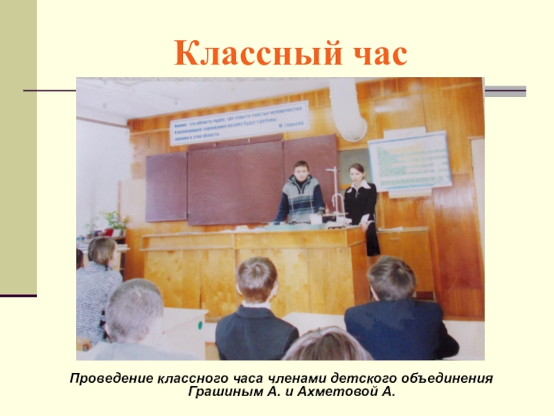 Проведение классного часа членами детского объединения Грашиным А. и Ахметовой
