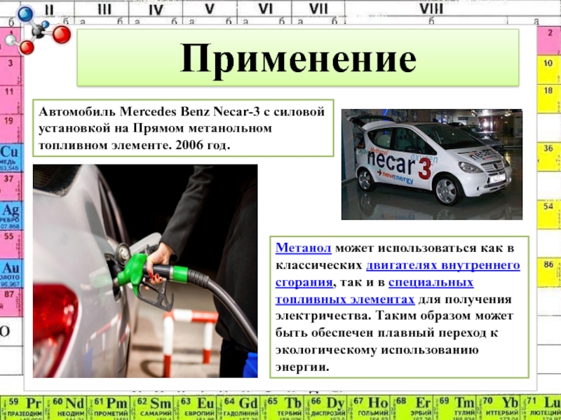 Метанол может использоваться как в классических двигателях внутреннего сгорания, так и в специальных топливных элементах для получения электричества. Таким образом может быть обеспечен плавный переход к экологическому использованию энергии.