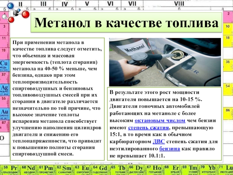 В результате этого рост мощности двигателя повышается на 10-15 %. Двигатели гоночных автомобилей работающих на метаноле с более высоким октановым числом чем бензин имеют степень сжатия, превышающую 15:1, в то время как в обычном карбюраторном ДВС степень сжатия для неэтилированного бензина как правило не превышает 10.1:1.