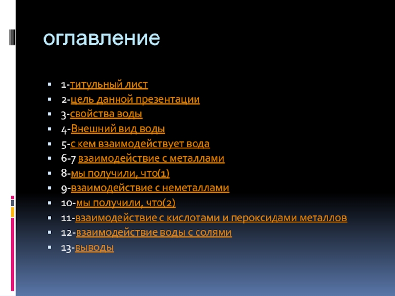 оглавление1-титульный лист2-цель данной презентации3-свойства воды4-Внешний вид воды5-с кем взаимодействует вода6-7 взаимодействие с металлами8-мы получили, что(1)9-взаимодействие с неметаллами10-мы