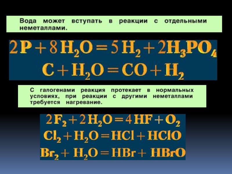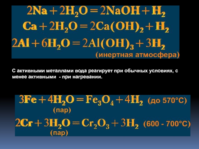 Слайд 7С активными металлами вода реагирует при обычных условиях, с менее активными