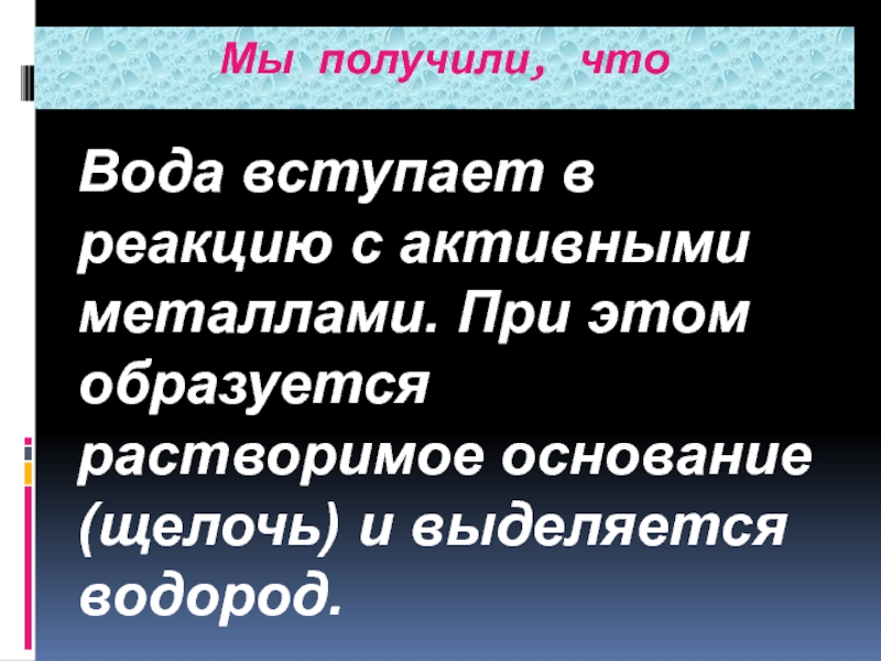 Мы получили, чтоВода вступает в реакцию с активными металлами. При этом образуется растворимое основание (щелочь) и выделяется