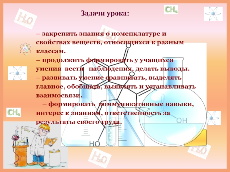 – закрепить знания о номенклатуре и свойствах веществ, относящихся к
