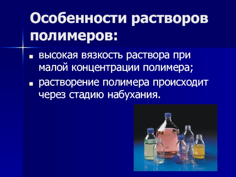 Особенности растворов полимеров:высокая вязкость раствора при малой концентрации полимера; растворение полимера происходит через стадию набухания.