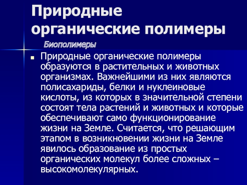 организмах. Важнейшими из них являются полисахариды, белки и нуклеиновые кислоты, из которых в значительной степени состоят тела растений и животных и которые обеспечивают само функционирование жизни на Земле. Считается, что решающим этапом в возникновении жизни на Земле явилось образование из простых органических молекул более сложных – высокомолекулярных.