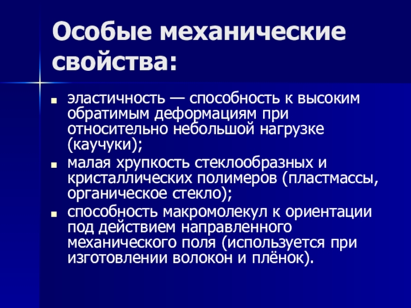 Особые механические свойства:эластичность — способность к высоким обратимым деформациям при относительно небольшой нагрузке (каучуки); малая хрупкость стеклообразных и кристаллических полимеров (пластмассы, органическое стекло); способность макромолекул к ориентации под действием направленного механического поля (используется при изготовлении волокон
