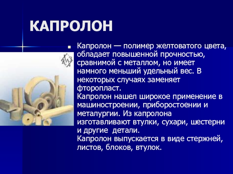 КАПРОЛОН Капролон — полимер желтоватого цвета, обладает повышенной прочностью, сравнимой с металлом, но имеет намного меньший удельный вес.