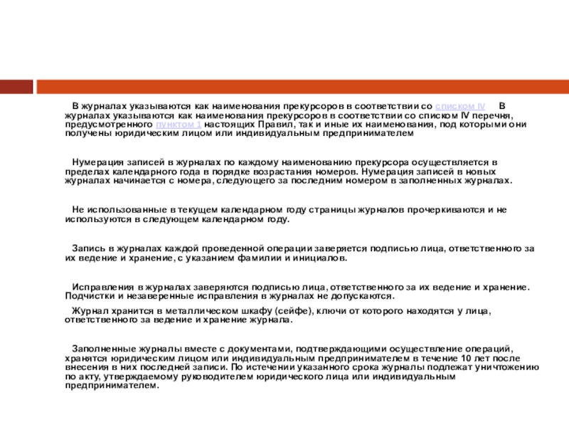 При осуществлении видов деятельности, связанных с оборотом прекурсоров, любые операции, при которых изменяется количество прекурсоров (далее - операции), подлежат занесению в специальный журнал регистрации операций (далее - журнал).