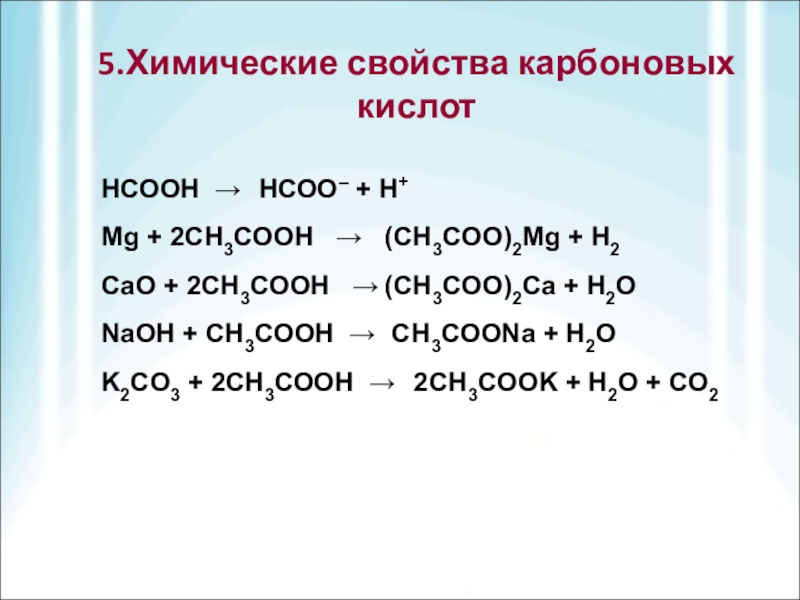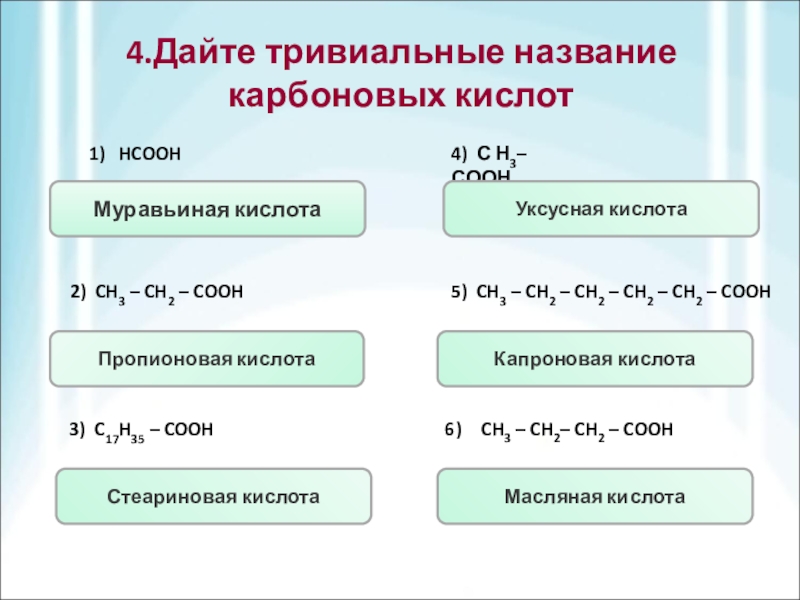 5) CH3 – CH2 – CH2 – CH2 – CH2 – COOH