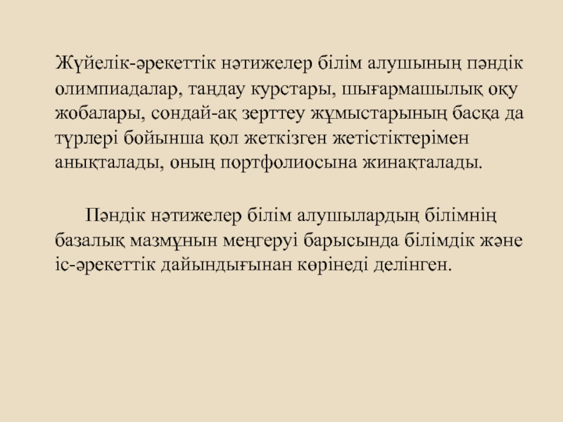 Пәндік нәтижелер білім алушылардың білімнің базалық мазмұнын меңгеруі барысында білімдік және іс-әрекеттік дайындығынан көрінеді делінген.
