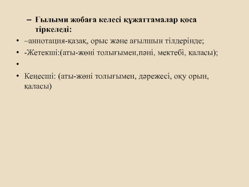 Слайд 29Ғылыми жобаға келесі құжаттамалар қоса тіркеледі: