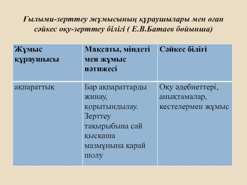 Ғылыми-зерттеу жұмысының құраушылары мен оған сәйкес оқу-зерттеу білігі ( Е.В.Батаев бойынша)