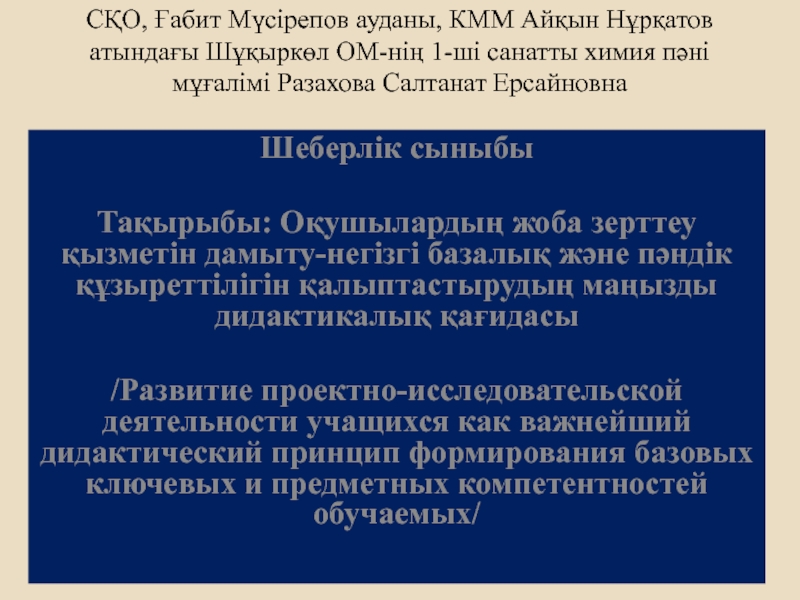Тақырыбы: Оқушылардың жоба зерттеу қызметін дамыту-негізгі базалық және пәндік құзыреттілігін қалыптастырудың маңызды дидактикалық қағидасы