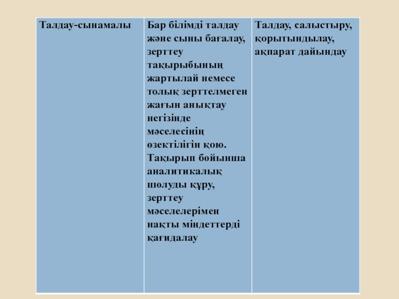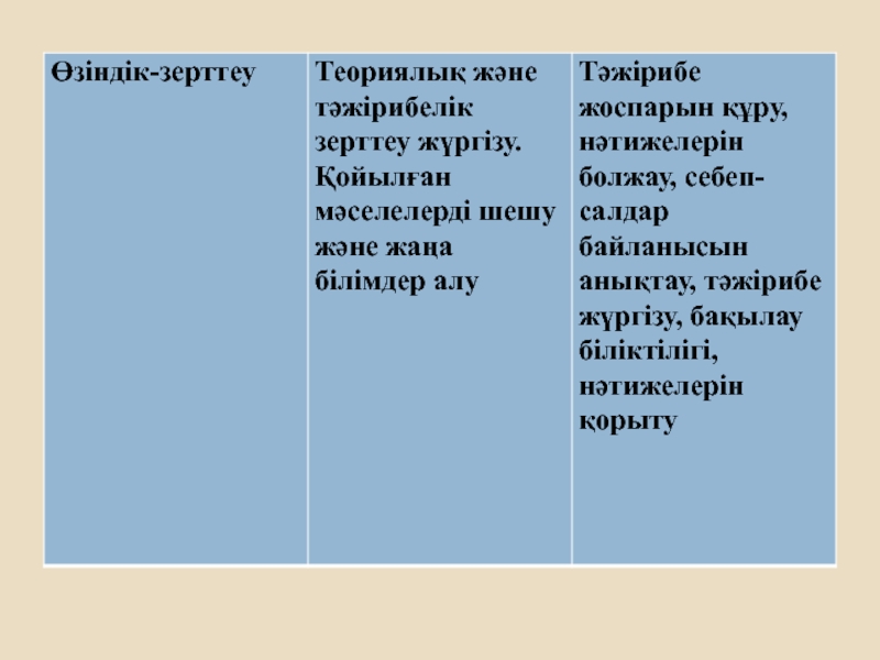 қоймай,жаңа білімдерін стандартты емес жағдайларда қолдану, ақпарат кеңістігінде тиімді жұмыс істеу, қарым-қатынас орнату, өз жетістігін нақты бағалау, зерттеу қызметінің технологиясына сүйеніп құзыреттілігін қалыптастыру талап етілуде. Практикада мәселелік оқыту, іздену, зерттеу, эвристикалық оқыту әдістері тиімді болуда. Оқушылардың зерттеу біліктілігі мен дағдысын дамыту нақты мақсаттарға жетуге көмектеседі.