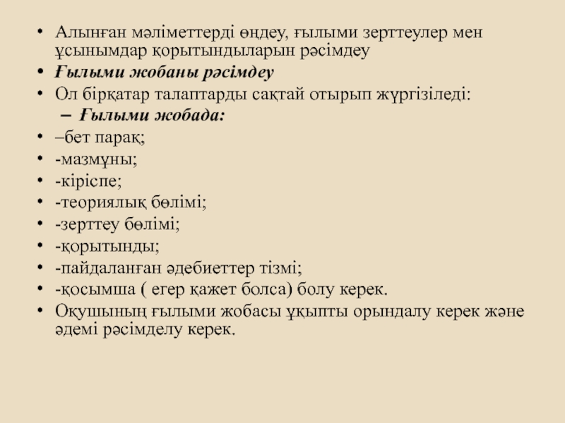 Слайд 28Алынған мәліметтерді өңдеу, ғылыми зерттеулер мен ұсынымдар қорытындыларын рәсімдеу