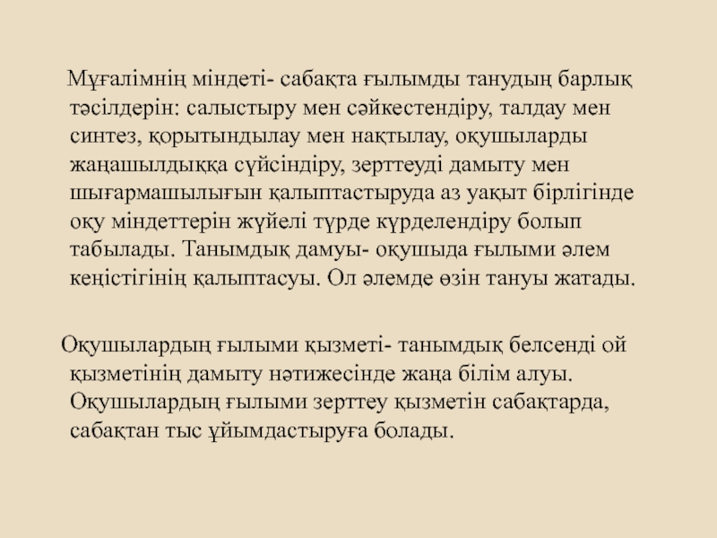 Слайд 13 Мұғалімнің міндеті- сабақта ғылымды танудың барлық тәсілдерін: салыстыру мен