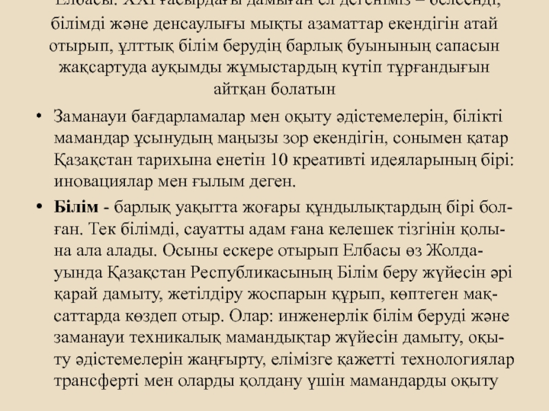 Заманауи бағдарламалар мен оқыту әдістемелерін, білікті мамандар ұсынудың маңызы зор екендігін, сонымен қатар Қазақстан тарихына енетін 10 креативті идеяларының бірі: иновациялар мен ғылым деген.