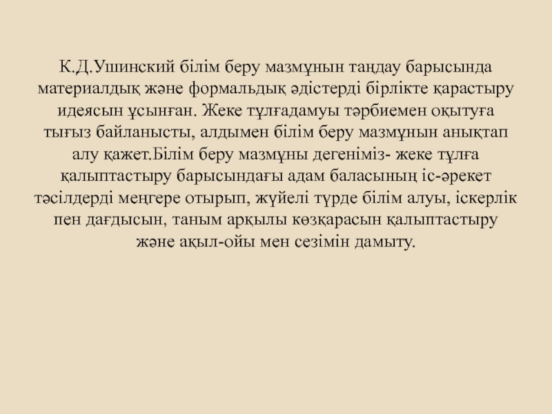 Слайд 6К.Д.Ушинский білім беру мазмұнын таңдау барысында материалдық және формальдық әдістерді бірлікте