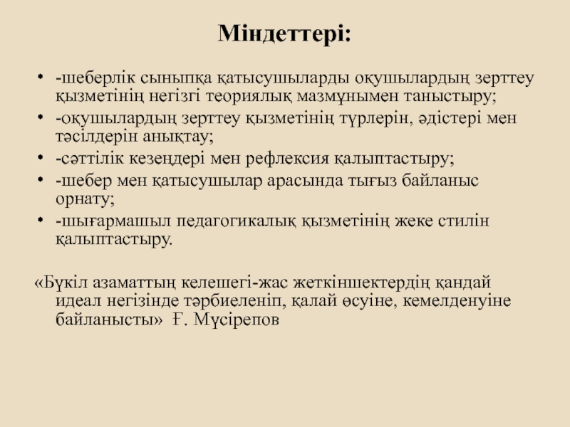 -шеберлік сыныпқа қатысушыларды оқушылардың зерттеу қызметінің негізгі теориялық мазмұнымен таныстыру;