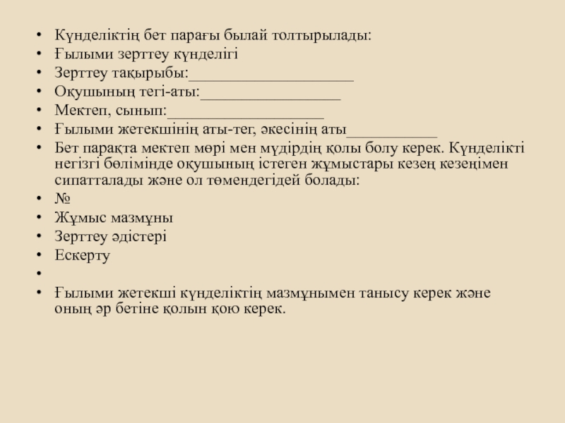 Ғылыми жетекші күнделіктің мазмұнымен танысу керек және оның әр бетіне қолын қою керек.