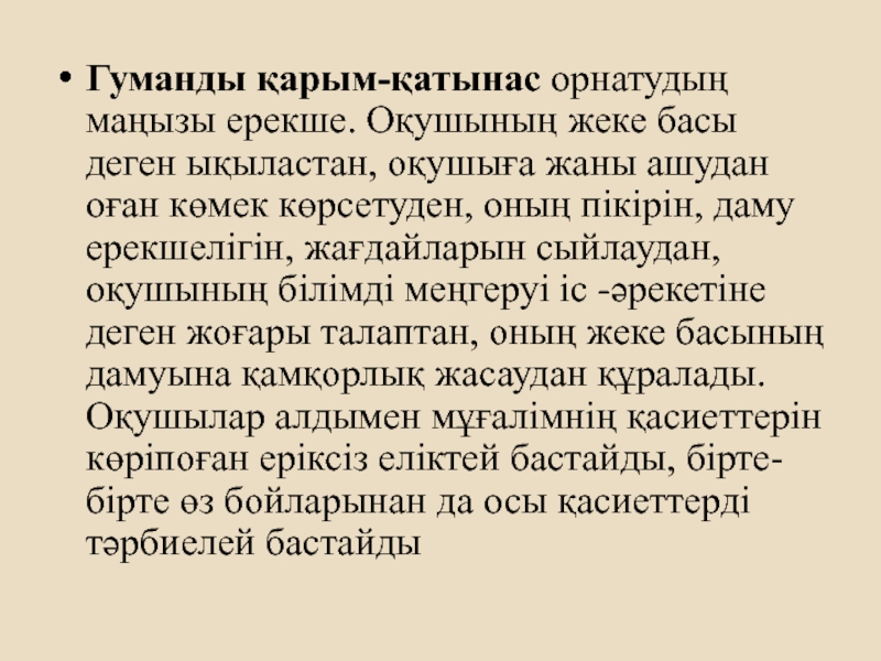 Слайд 7Гуманды қарым-қатынас орнатудың маңызы ерекше. Оқушының жеке басы деген ықыластан, оқушыға