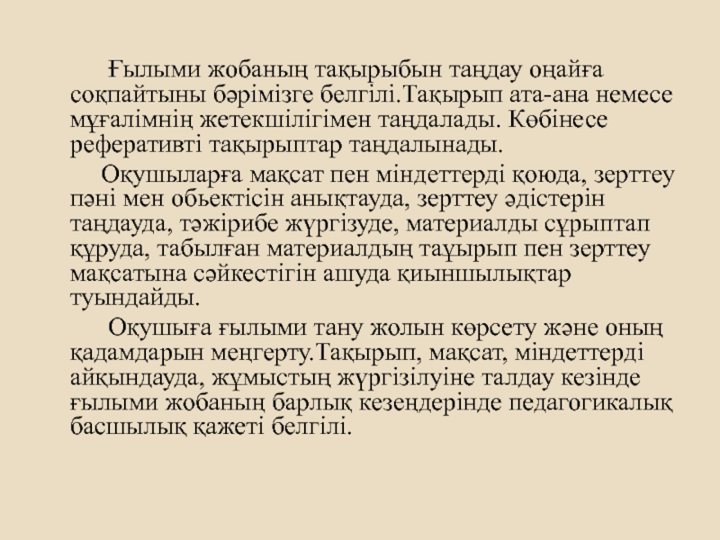 Оқушыға ғылыми тану жолын көрсету және оның қадамдарын меңгерту.Тақырып, мақсат, міндеттерді айқындауда, жұмыстың жүргізілуіне талдау кезінде ғылыми жобаның барлық кезеңдерінде педагогикалық басшылық қажеті белгілі.