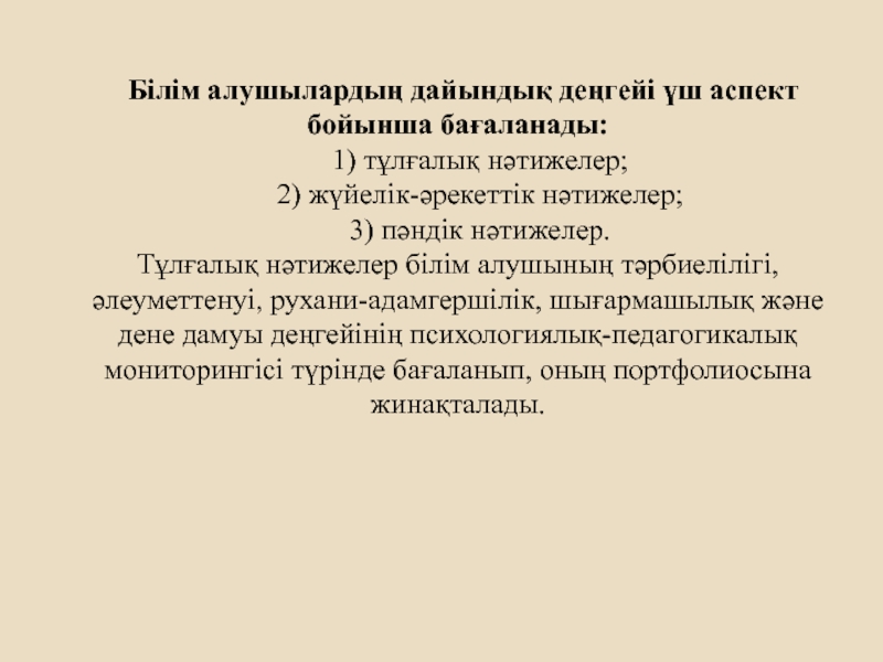 Слайд 9 Білім алушылардың дайындық деңгейі үш аспект бойынша бағаланады: