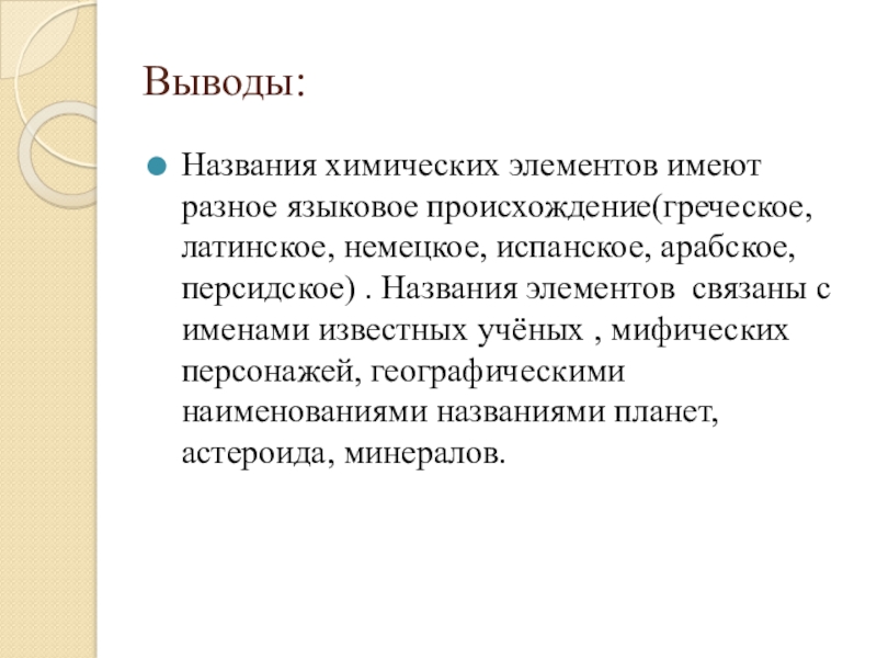 Выводы:Названия химических элементов имеют разное языковое происхождение(греческое, латинское, немецкое, испанское, арабское, персидское) . Названия элементов связаны с