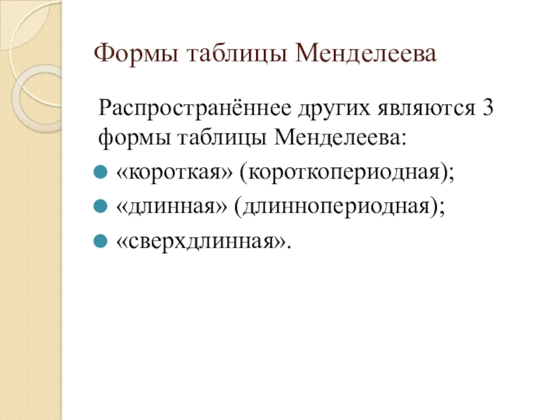 Формы таблицы МенделееваРаспространённее других являются 3 формы таблицы Менделеева:«короткая» (короткопериодная);«длинная» (длиннопериодная);«сверхдлинная».