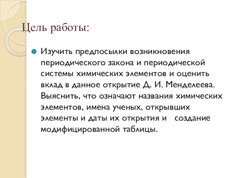 Цель работы:Изучить предпосылки возникновения периодического закона и периодической системы химических элементов и оценить вклад в данное открытие