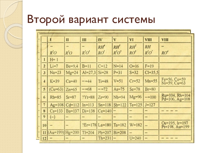 Второй вариант системыВ 1871 году Д. И. Менделеев дает второй вариант периодической системы (так называемую короткую форму
