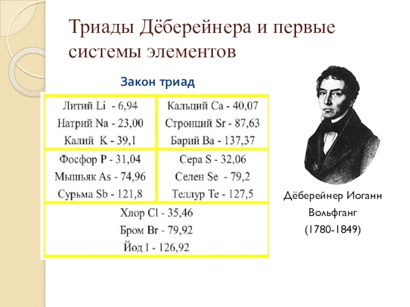 Триады Дёберейнера и первые системы элементовДёберейнер Иоганн Вольфганг(1780-1849)Закон триад