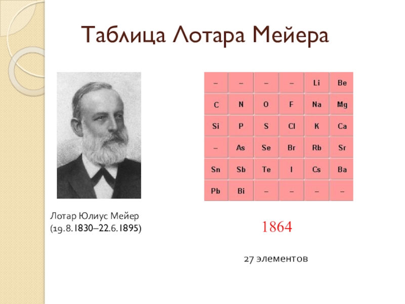 Таблица Лотара Мейера186427 элементовЛотар Юлиус Мейер (19.8.1830–22.6.1895)