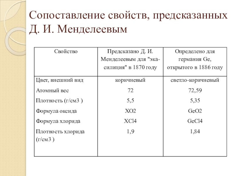 Слайд 13Сопоставление свойств, предсказанных Д. И. Менделеевым