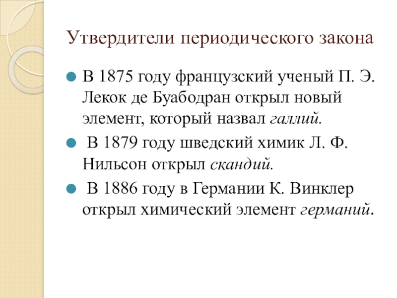 Утвердители периодического законаВ 1875 году французский ученый П. Э. Лекок де Буабодран открыл новый элемент, который назвал